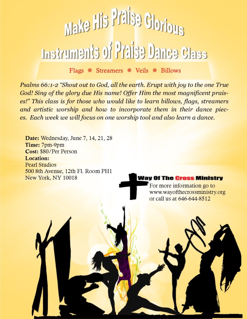 This class is for those who would like to learn to use billows, flags, streamers and veils and how to incorporate them in their dance pieces. Each week we will focus on one worship tool and also learn a dance. Please contact me if you are only interested in joining us for one day.
